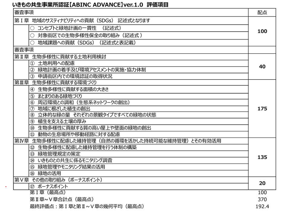2018年度、一般社団法人いきもの共生事業推進協議会(略称ABINC)は、複数街区あるいは複数の事業所が含まれる一体的な開発を認証の対象とし、さらに SDGs 達成の取組の視点をも評価する、ABINC ADVANCE認証を開発しました。これにより、個別の事業所では限定的であった生物多様性に配慮した緑地面積を、よりまとまった面積で確保することや、隣接街区で一体的に生物多様性への配慮に取組むことで、地域の生態系ネットワークの構築により貢献できる開発を推奨できることとなりました。
