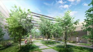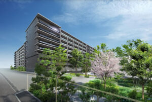 近鉄奈良線「富雄駅」から徒歩4分の総戸数244戸の集合住宅です。エントランスや中庭、開発公園にまとまった緑を創出しています。植栽樹種は地域の在来種を中心に選定し、バードバスなども設置します。また、雨水利用の取り組みとして、敷地全体で雨水を植栽の潅水に利用するスマートウォータータンクを設置しました。