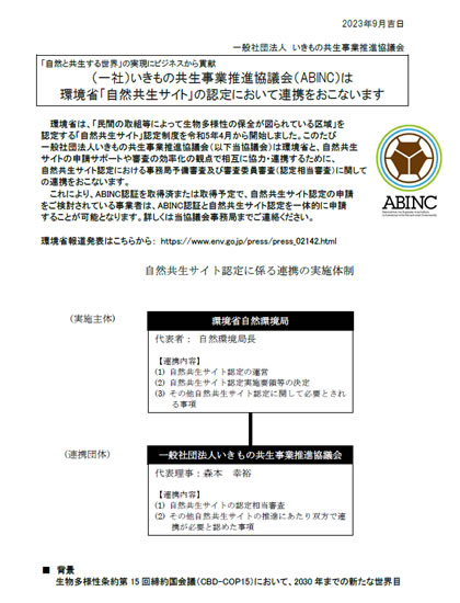 (一社)いきもの共生事業推進協議会(ABINC)は、 環境省「自然共生サイト」の認定において連携をおこないます