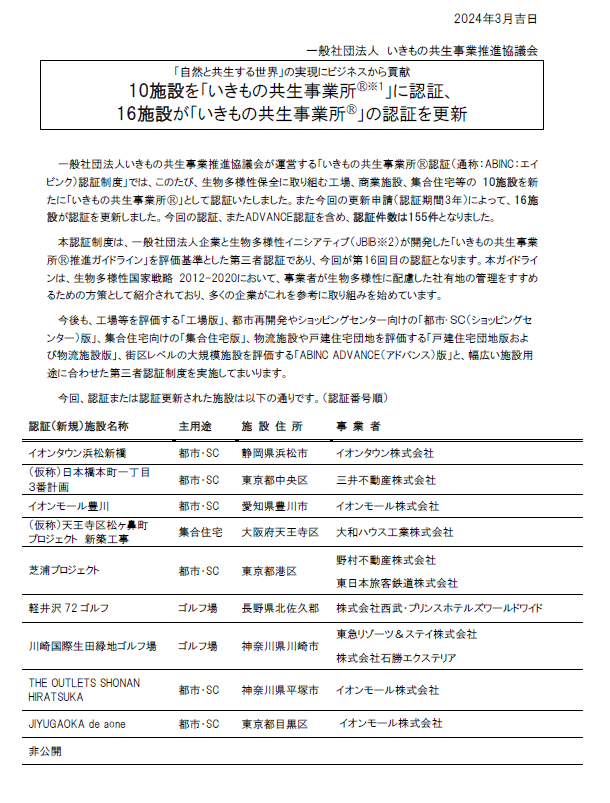 一般社団法人いきもの共生事業推進協議会が運営する「いきもの共生事業所Ⓡ認証(通称:ABINC:エイビンク)認証制度」では、このたび、生物多様性保全に取り組む工場、商業施設、集合住宅等の 10施設を新たに「いきもの共生事業所Ⓡ」として認証いたしました。また今回の更新申請(認証期間3年)によって、16施設が認証を更新しました。今回の認証、またADVANCE認証を含め、認証件数は155件となりました。