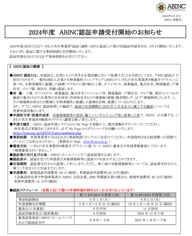 2024年度1回目となる「いきもの共生事業所®認証(通称:ABINC認証)」の第17回認証申請受付を、4月より開始いたします。