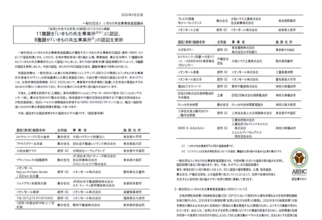 一般社団法人いきもの共生事業推進協議会が運営する「いきもの共生事業所Ⓡ認証(通称:ABINC:エイビンク)認証制度」では、このたび、生物多様性保全に取り組む工場、商業施設、集合住宅等の 11施設を新たに「いきもの共生事業所Ⓡ」として認証いたしました。また今回の更新申請(認証期間3年)によって、9施設が認証を更新しました。今回の認証、またADVANCE認証を含め、認証件数は139件となりました。 本認証制度は、一般社団法人企業と生物多様性イニシアティブ(JBIB※2)が開発した「いきもの共生事業所Ⓡ推進ガイドライン」を評価基準とした第三者認証であり、今回が第14回目の認証となります。
