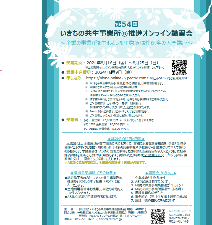 第54回 いきもの共生事業所®推進オンライン講習会の受付を開始いたしました