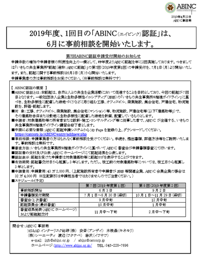 2019年度、第1回目の「ABINC(エイビンク)認証」は、6月3日(月)に事前相談を開始いたします。