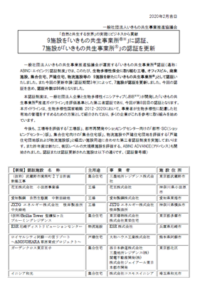 このたび、生物多様性保全に取り組む工場、集合住宅、戸建住宅、物流施設の9施設を「いきもの共生事業所」として認証いたしました。また、7施設で認証を更新しました。