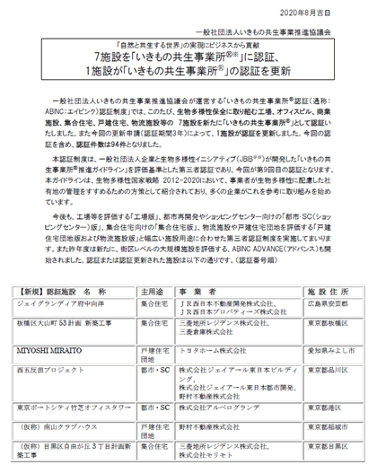 このたび、生物多様性保全に取り組む集合住宅、戸建住宅、都市・ショッピングセンターの