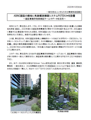 ABINCでは、ABINC認証を取得した事業所の一つである「大手門タワー・ENEOSビル/大手町パークビルディング」様のご協力を得て、その外構緑地に、気象観測機器システムPOTEKA®1を設置し、緑地の微気象観測実験を10月1日より開始いたしました。観測は2021年9月末までを予定し、2020年7月から8月の期間を含め、1年を通じた気温や湿度等の情報がPOTEKA®サービスを通じて公開されます。
