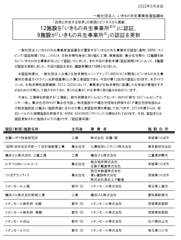 生物多様性保全に取り組む工場、商業施設、集合住宅等の 12施設を新たに「いきもの共生事業所Ⓡ」として認証いたしました。