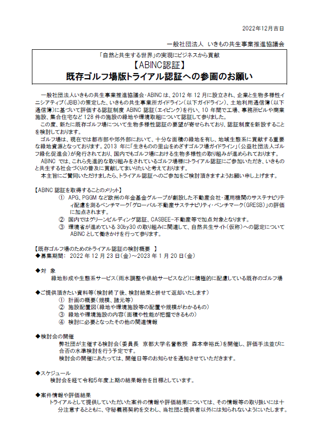ABINC既存ゴルフ場版トライアル認証への参画のお願い